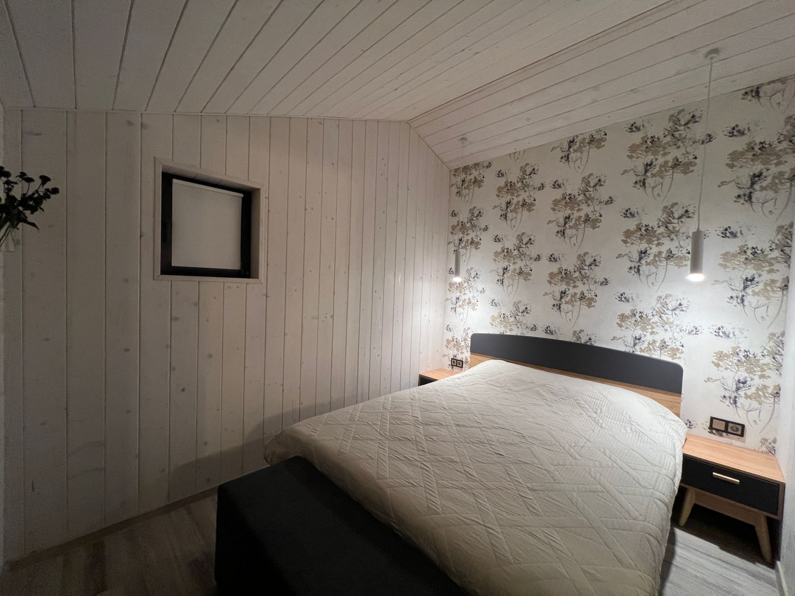 Спальня: Уютная комната с двуспальной кроватью, тумбочками и пуфом.